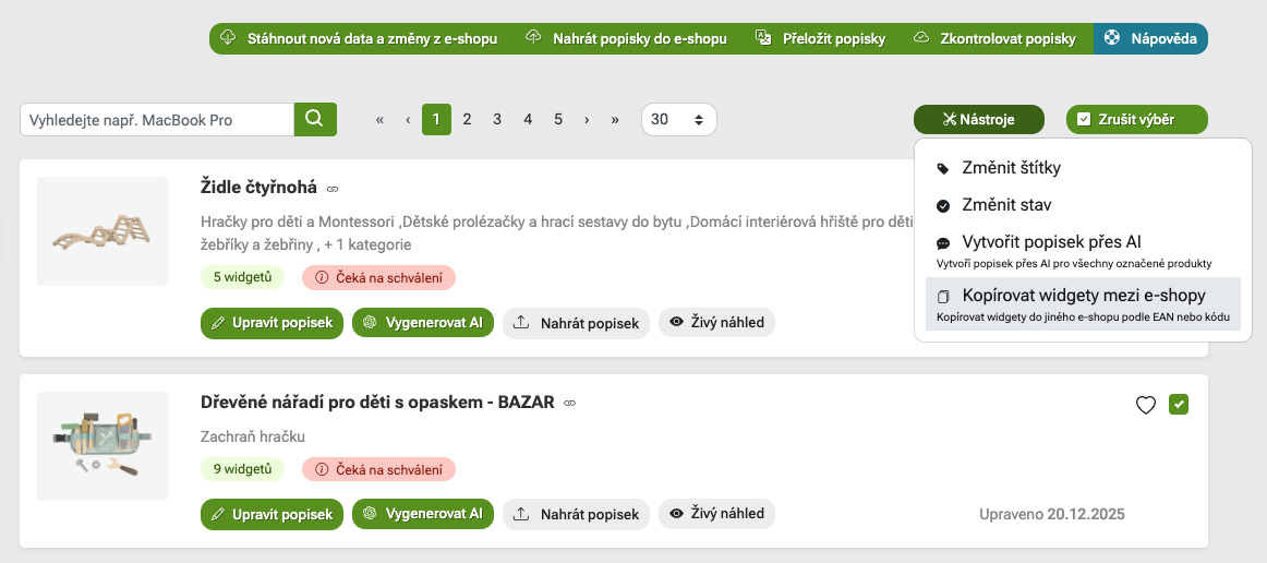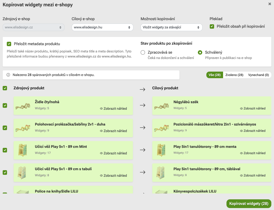 Until now, it was only possible to copy widgets between e-shops one product at a time and it was necessary to always search for a product in the target e-shop based on the name. We added a feature to Pobo Page Builder that allows you to copy widgets in bulk between different instances of e-shops and also translate them.