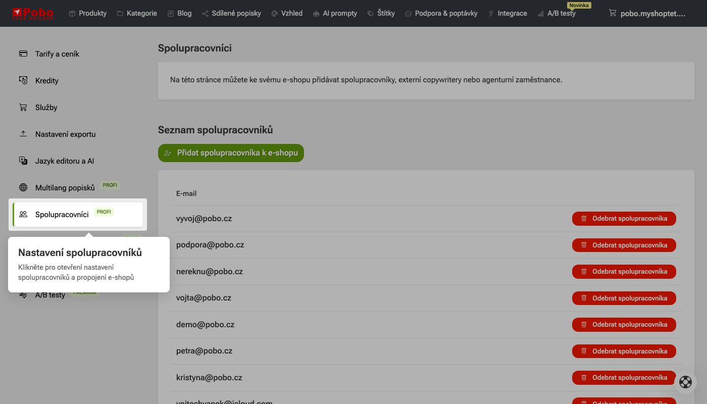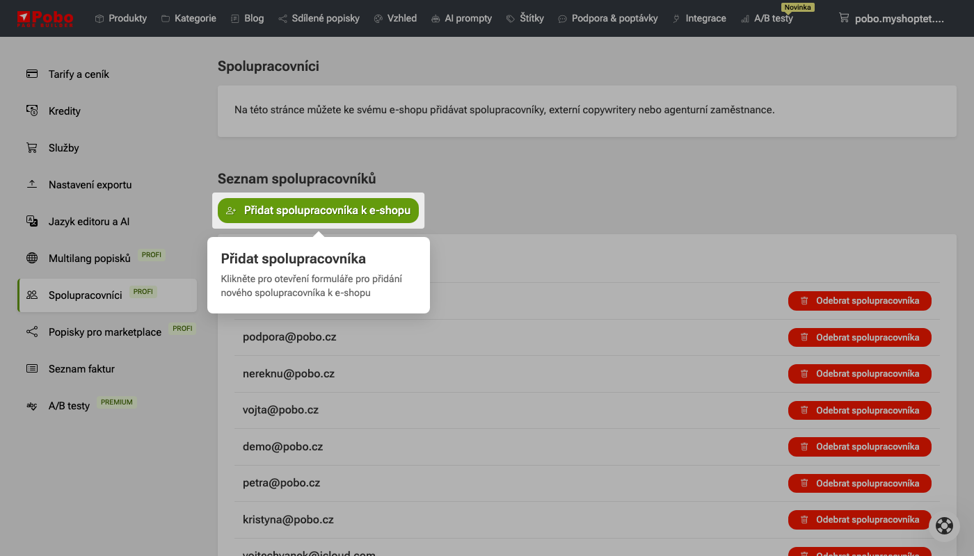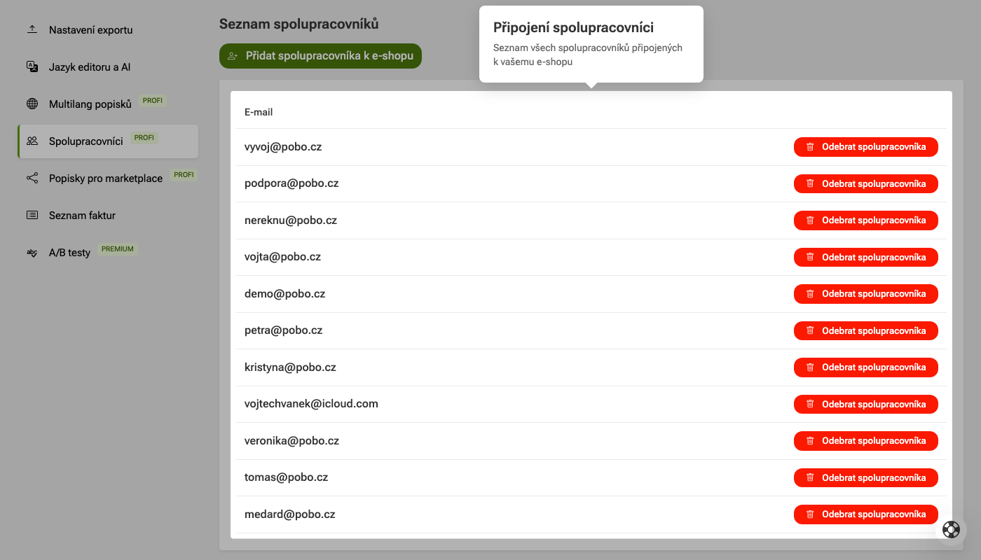V seznamu můžete spolupracovníka také odebrat, čímž ztratí přístup k vašemu e-shopu.