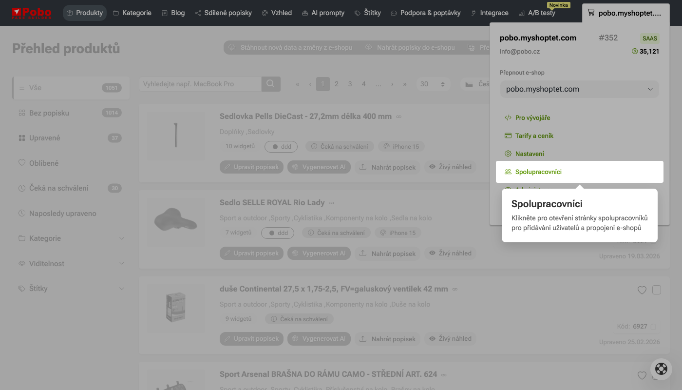 Ke svému e-shopu můžete přizvat spolupracovníka, který vám může pomoci s vytvářením obsahu. Spolupracovníka pozvete kliknutím na uživatelské menu: