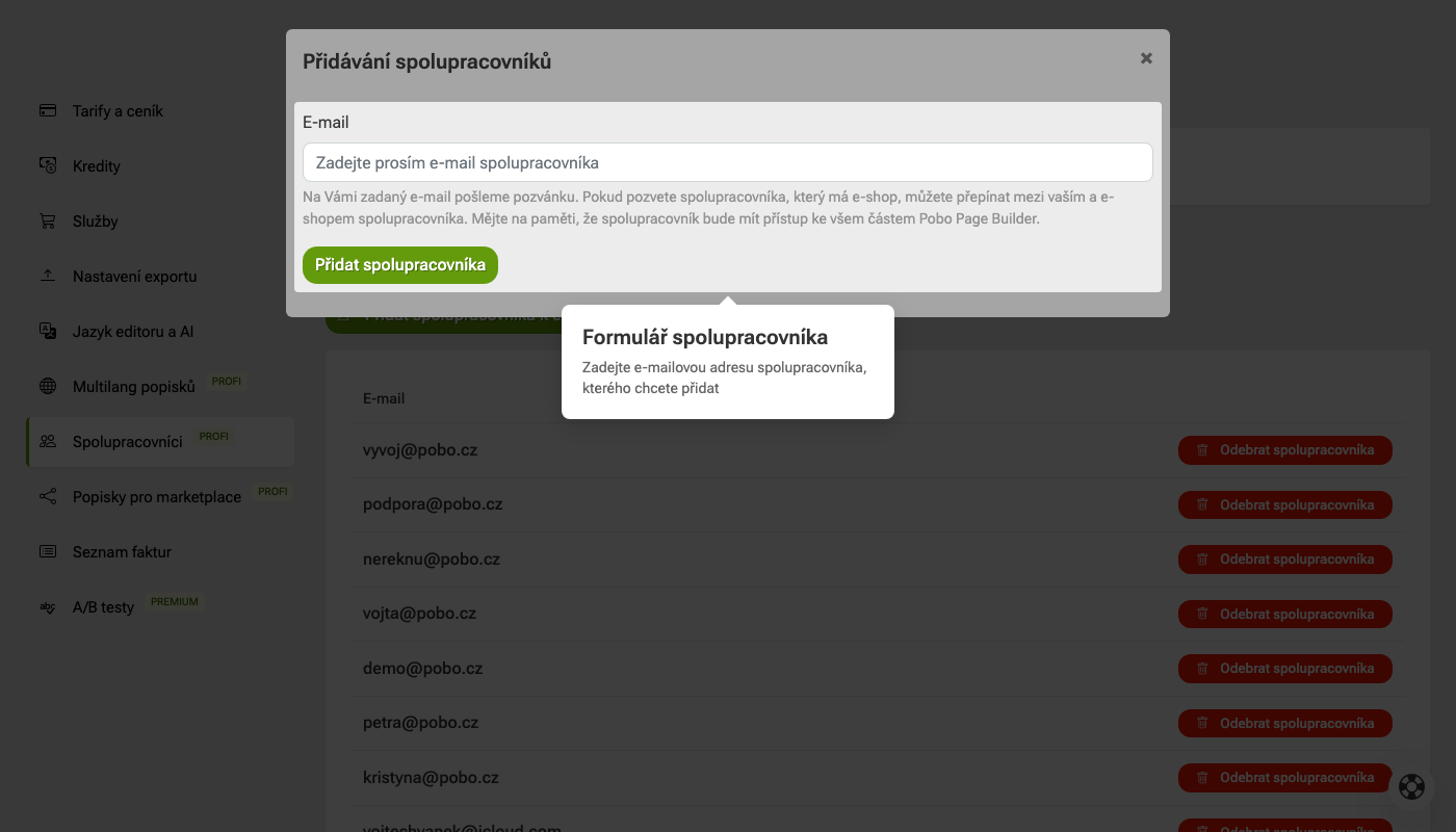 Následně se vám otevře modální okno, ve kterém vyplňte e-mail spolupracovníka: