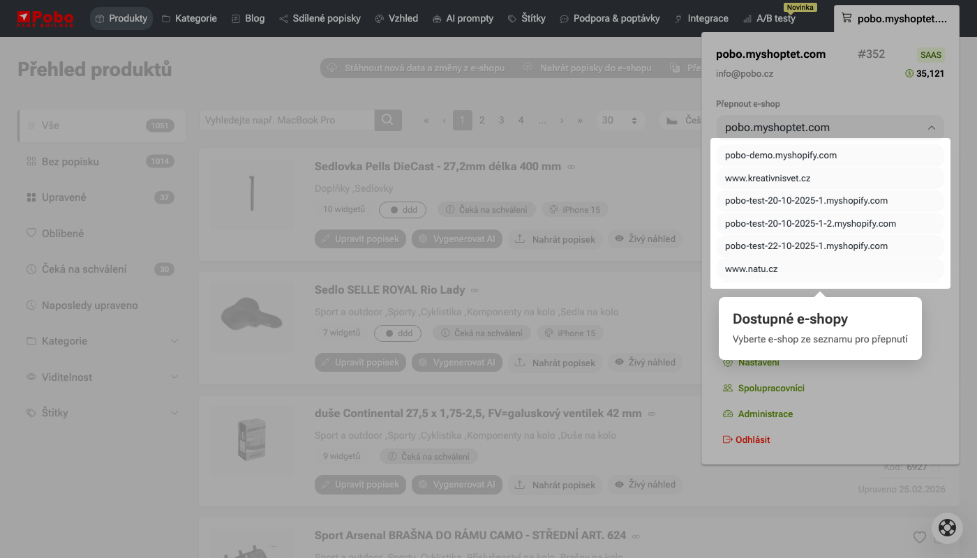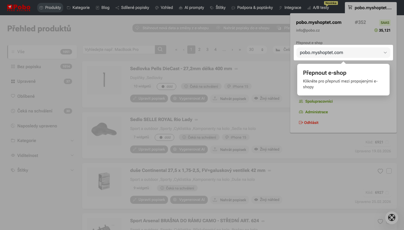 Pobo Page Builder umožňuje spravovat více e-shopů pod jedním e-mailem. E-shop můžete přepínat kliknutém na uživatelské menu: